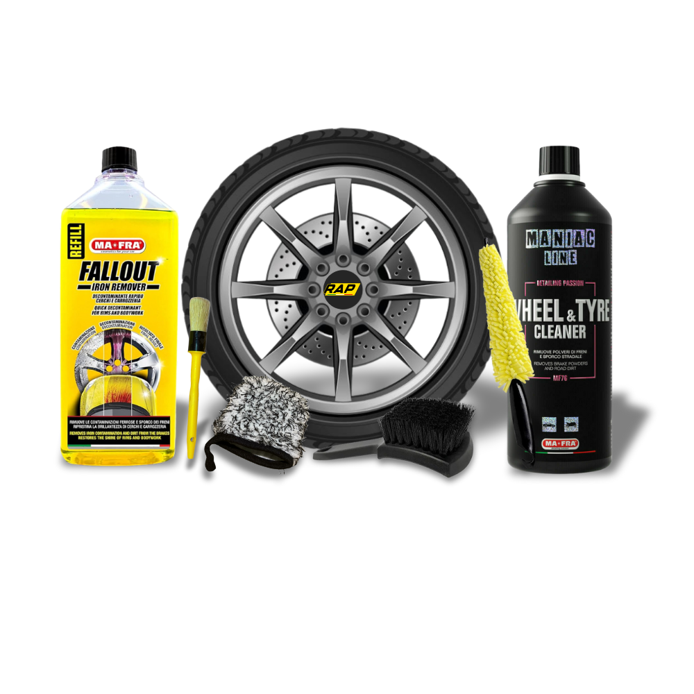 Il set definitivo per la cura e la pulizia profonda di cerchi e pneumatici. Include prodotti di alta qualità Mafra e Maniac Line per eliminare contaminazioni ferrose e sporco ostinato, insieme a una selezione esclusiva di accessori RAP studiati per la massima precisione e sicurezza.