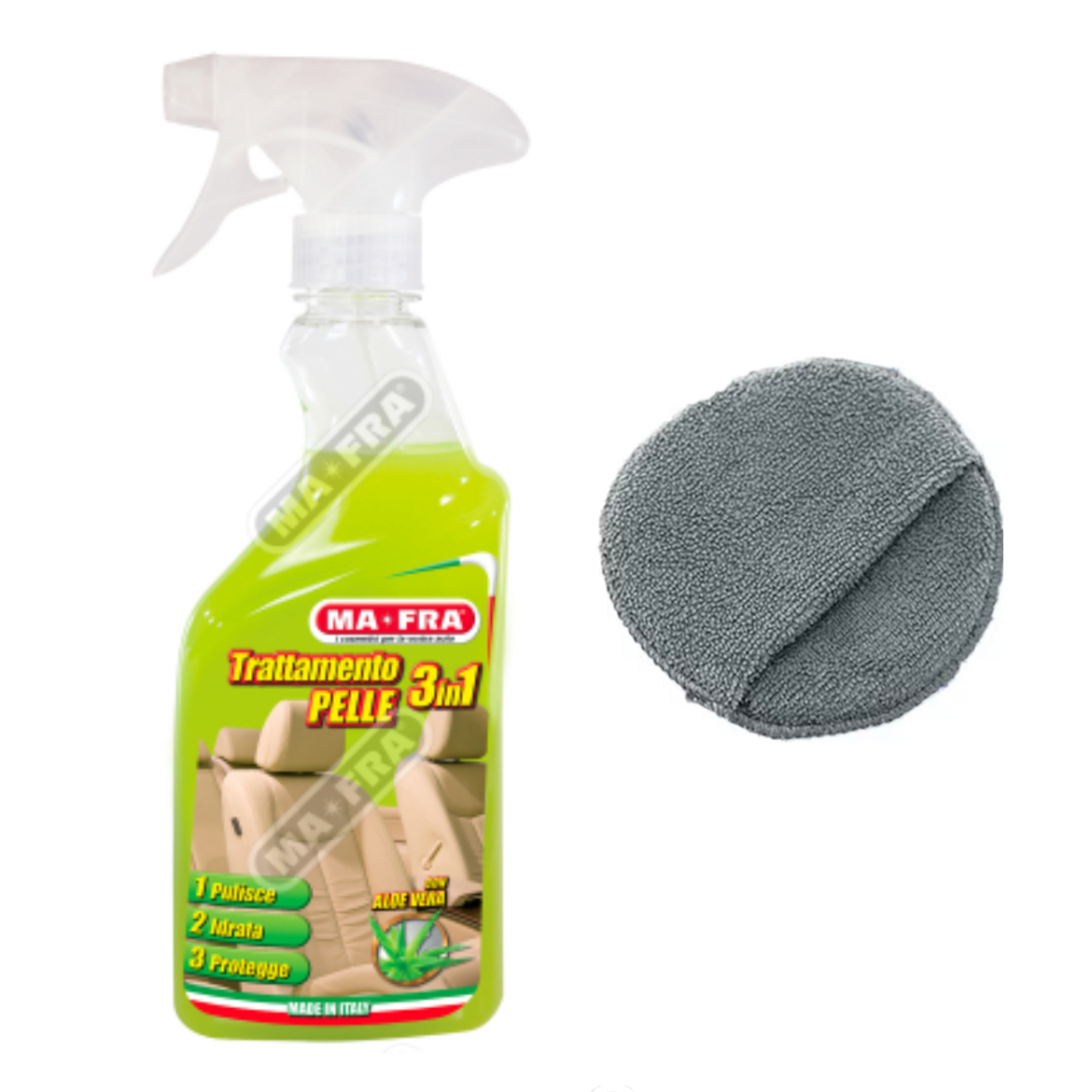 TRATTAMENTO 3 in 1 PELLE è un mix di detergenti, aloe vera e cere naturali, che aiutano a garantire una profonda, ma delicata, pulizia delle superfici, mantenendo e ravvivando i sedili in pelle e tutti gli inserti della macchina, rilasciando anche un gradevole aroma nell’abitacolo.