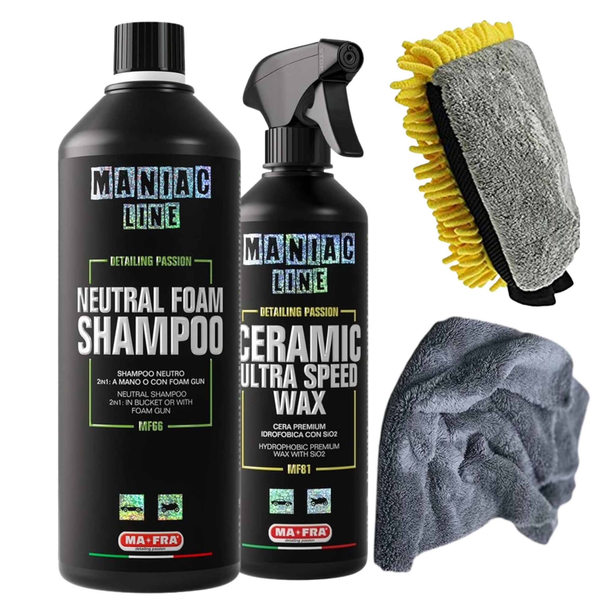 Tutto ciò che ti serve per un lavaggio completo, sicuro ed efficace degli esterni. Il Maniac Box è il kit perfetto per chi pretende il massimo dal detailing, anche a casa.