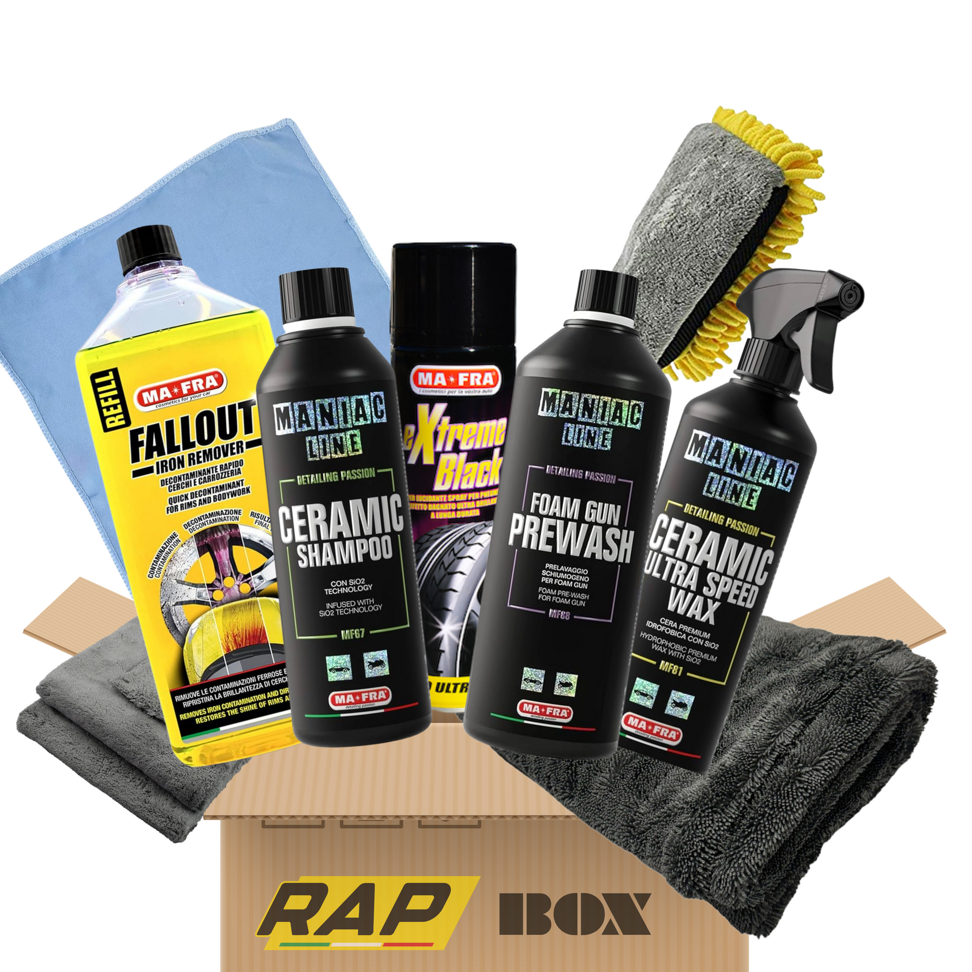 RAP BOX – Lavaggio Pro è il kit pensato per chi pretende il massimo dal lavaggio auto. Una selezione di prodotti avanzati della linea Maniac by MA-FRA, pensati per garantire un’azione efficace e sicura anche su vetture protette, in combinazione con accessori firmati RAP di qualità superiore.
