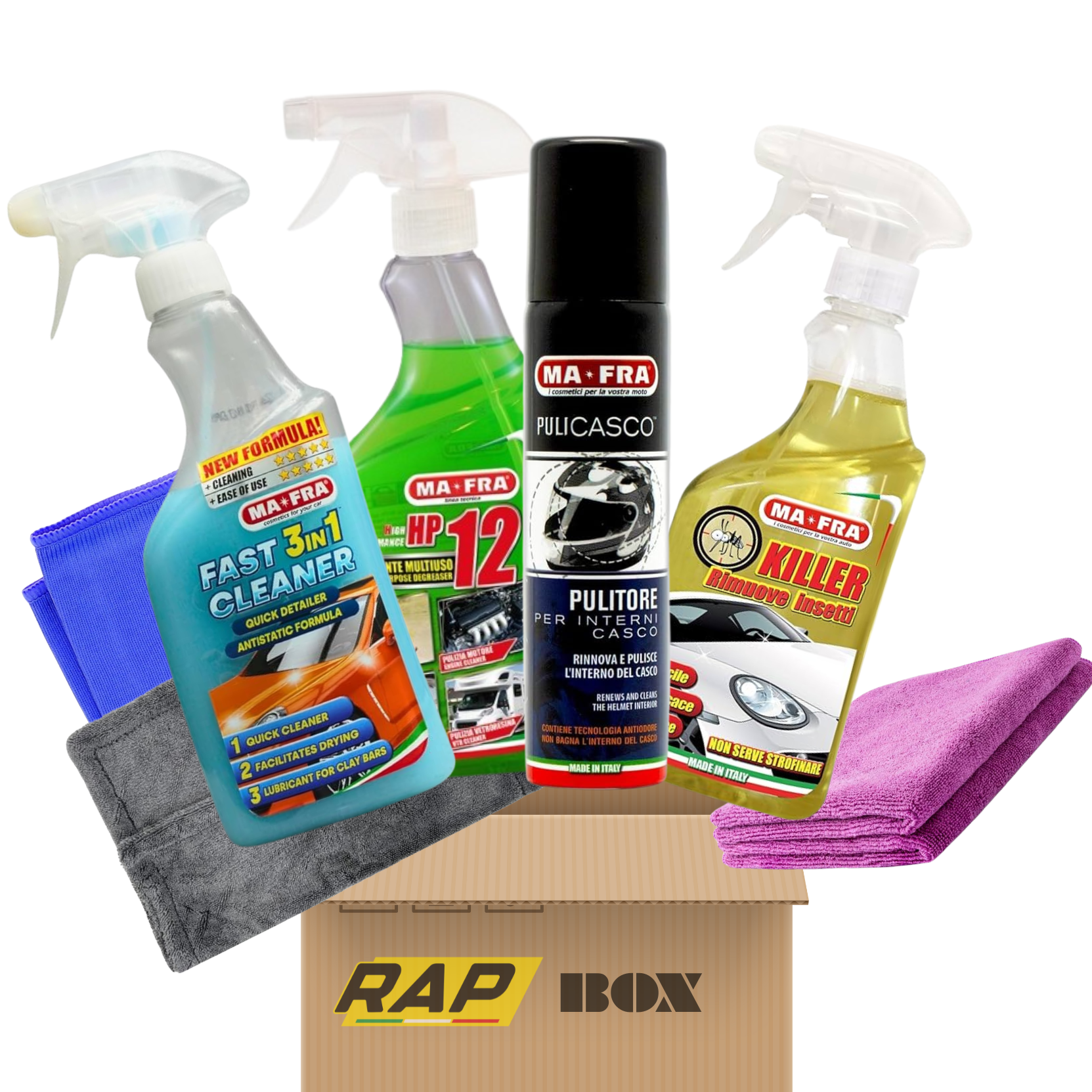 La RAP BOX Moto/Scooter Facile è il kit completo studiato per la pulizia pratica e veloce di moto, scooter e casco. Tutti i prodotti essenziali, selezionati per garantire risultati professionali con la massima semplicità.
