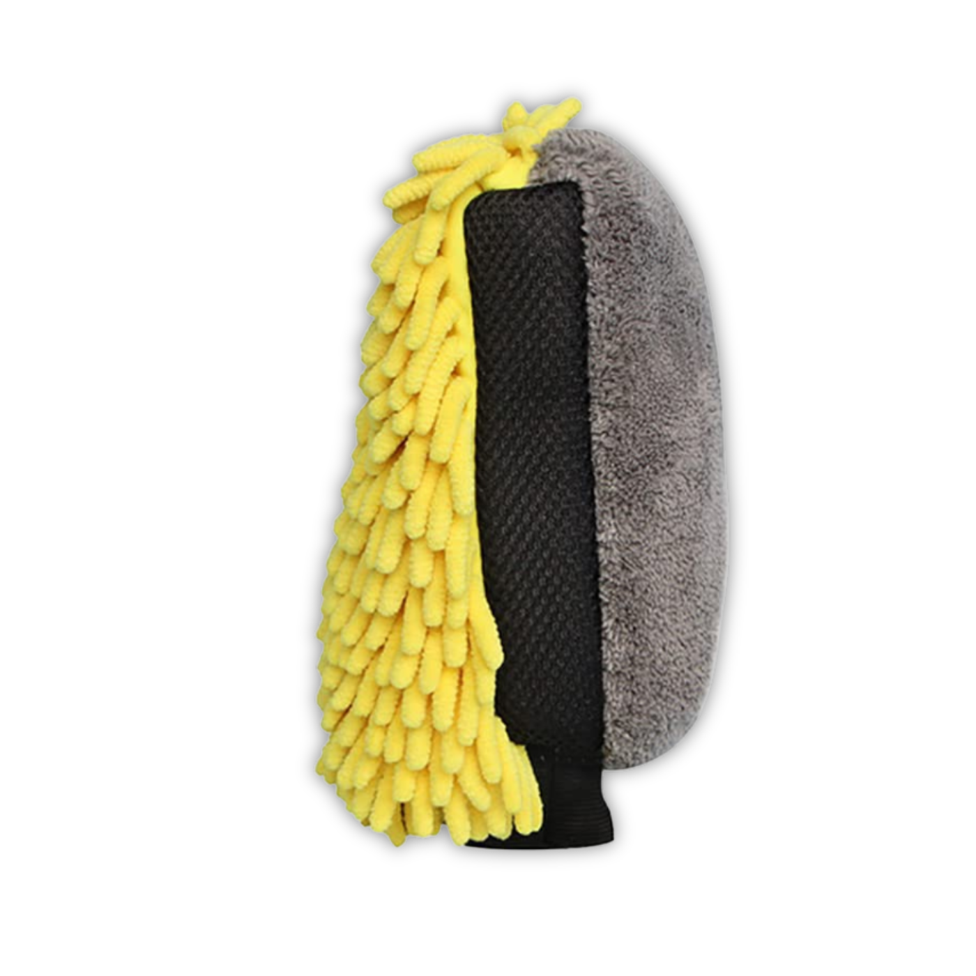 Guanto professionale per il lavaggio auto realizzato in microfibra ultra morbida, progettato per rimuovere efficacemente lo sporco senza graffiare la vernice. Dotato di doppia superficie: un lato in chenille gialla per lo sporco più ostinato, e un lato in microfibra grigia ad alta densità per una finitura delicata e uniforme.