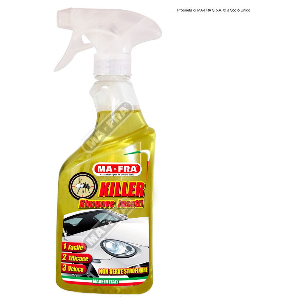 rimuovere efficacemente qualunque traccia lasciata da ogni genere di insetto o da piccoli moscerini, adatto per la carrozzeria, i cristalli, i paraurti o i vetri della fanaleria, un prodotto per ogni parte esterna della vostra vettura. Killer con efficacia e semplicità si applica anche per la rimozione di antiestetiche macchie come residui biologici di volatili dalla carrozzeria o dal tetto della vostra auto senza lasciare alcuna traccia. Killer è il prodotto che con estrema facilità e rapidità ma soprattutto senza la necessità di strofinare, scioglie ogni residuo di insetto anche secco, dalla lamiera e da tutte le parti in plastica dell’auto senza intaccare la vernice con la massima sicurezza e in pochi istanti con l’ausilio di una semplice spugna o guanto in microfibra.