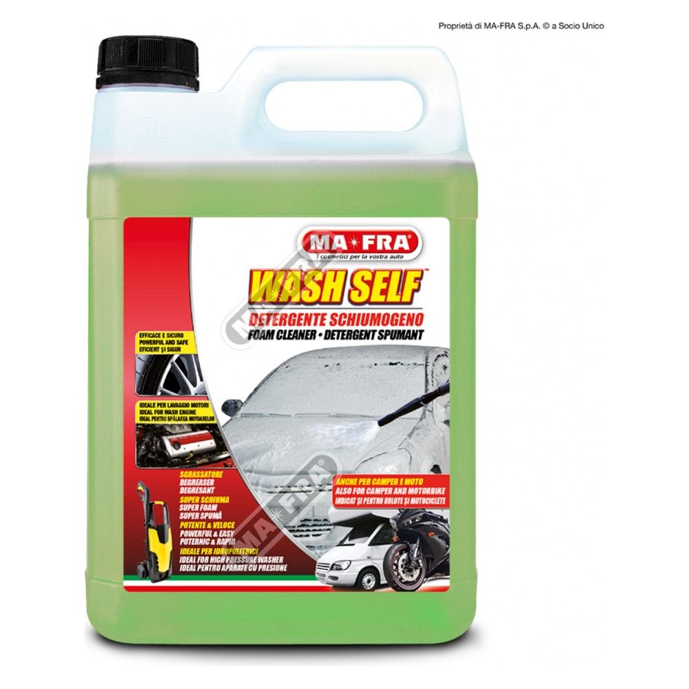 Wash Self di Mafra è un detergente schiumogeno per idropulitrice e Nebula Foam 2.0, professionale e super concentrato ad alto potere lucidante, adatto per auto, moto e camper.