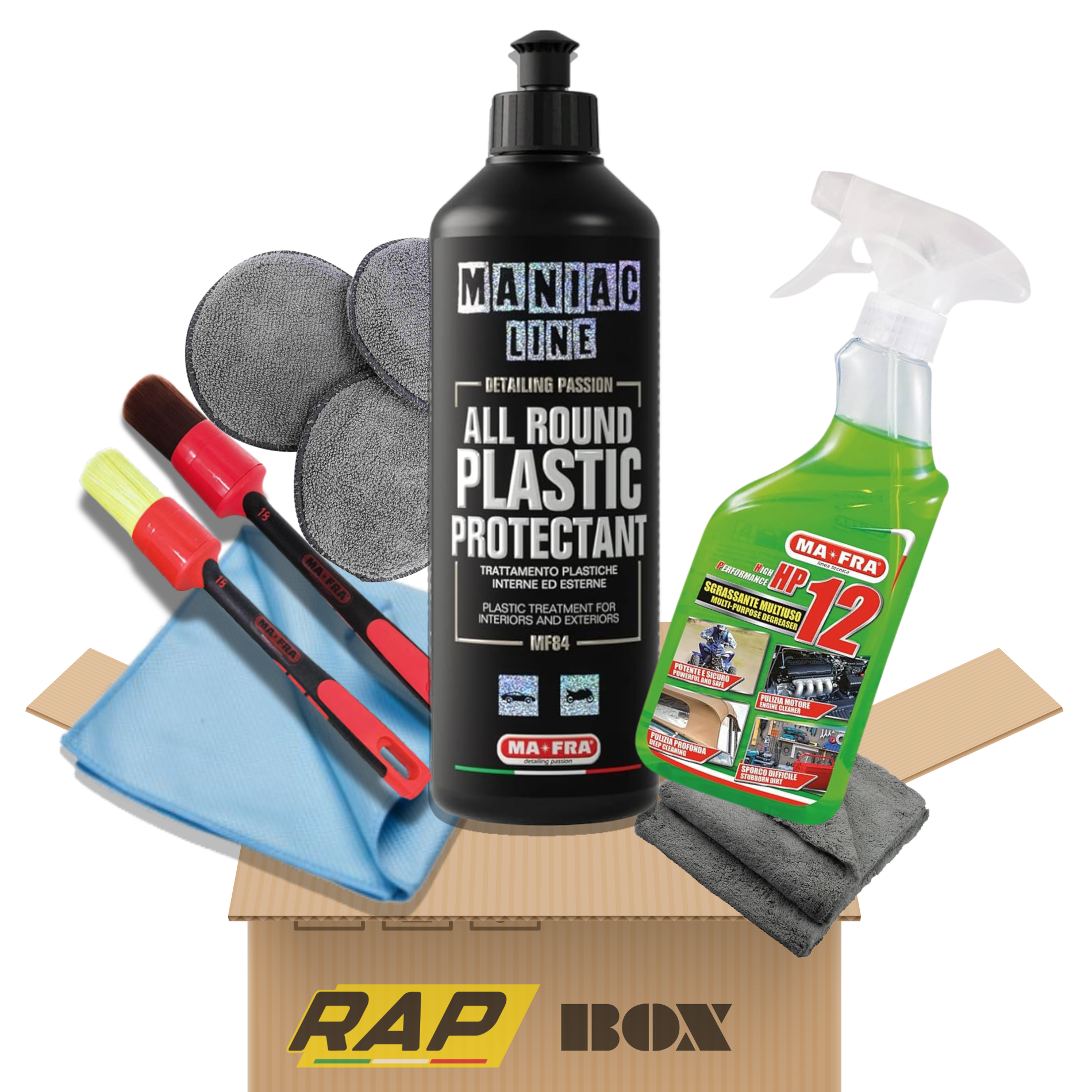 RAP BOX – Interni Pro è il pacchetto perfetto per chi vuole lavorare in modo più preciso ed efficace, curando ogni dettaglio dell’abitacolo con strumenti adeguati. Una soluzione completa, senza eccessi, pensata per ottenere un abitacolo pulito, ordinato e visivamente rinnovato.